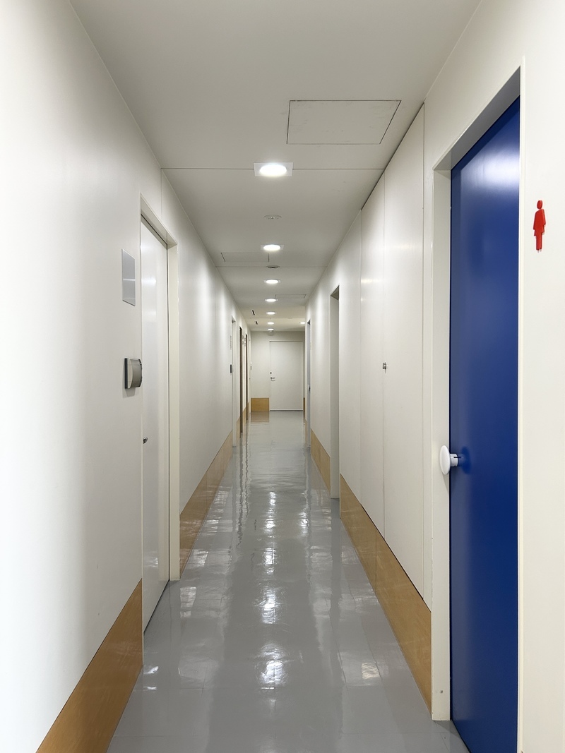 館内は全体に白壁で落ち着いた雰囲気の中、共用部のEVやトイレの扉などにアクセントカラーで楽しさもあり
