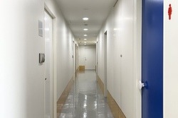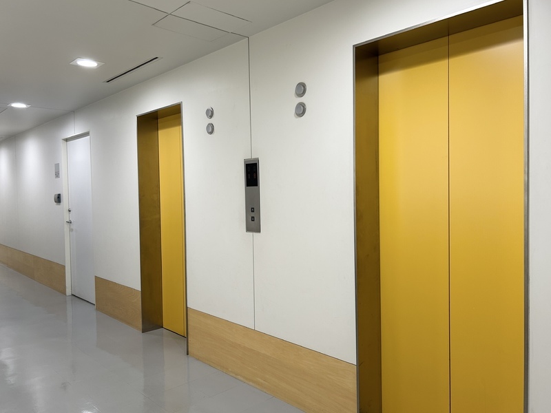 館内は全体に白壁で落ち着いた雰囲気の中、共用部のEVやトイレの扉などにアクセントカラーで楽しさもあり