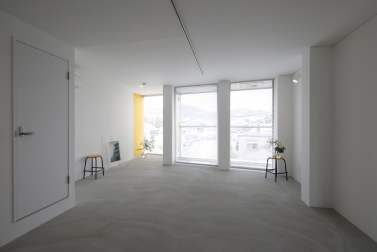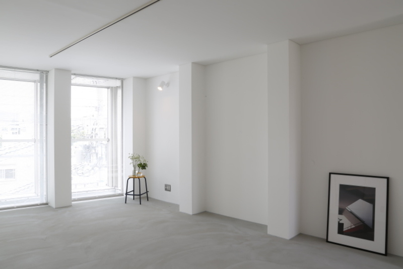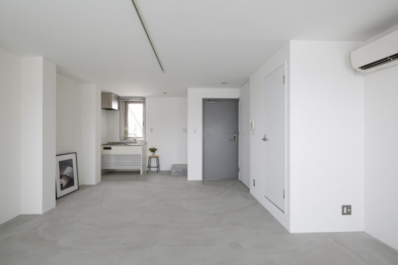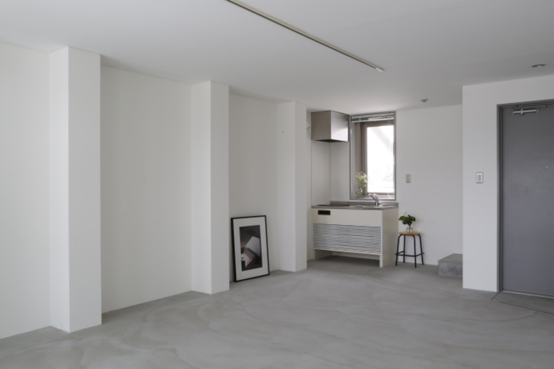 壁は白のペンキ塗装。床はモルタル床で、爽やかな開放感のある空間です。